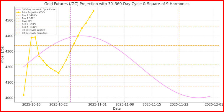 The Gold Futures projection integrating the 30–360-day cycle curve and Square-of-9 harmonic levels.