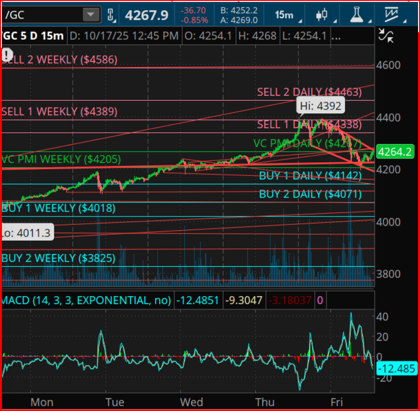 Gold futures continue to trade within a controlled correction phase, balancing near key VC PMI levels, while the broader 30–360-day cycle structure remains bullish. The recent retracement from $4,392 to $4,200 aligns precisely with a mid-cycle mean reversion typical of the 30-day sub-cycle in a larger 360-day upturn that began in late September.