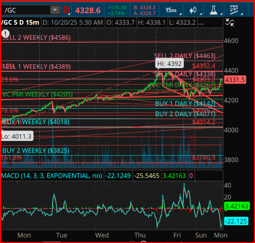 - Dashed lines mark key VC PMI weekly levels — Buy 2 ($3,825), Buy 1 ($4,018), Pivot ($4,205), Sell 1 ($4,389), and Sell 2 ($4,586) — corresponding to Gann’s 30°–90° harmonics on the Square of 9 spiral.